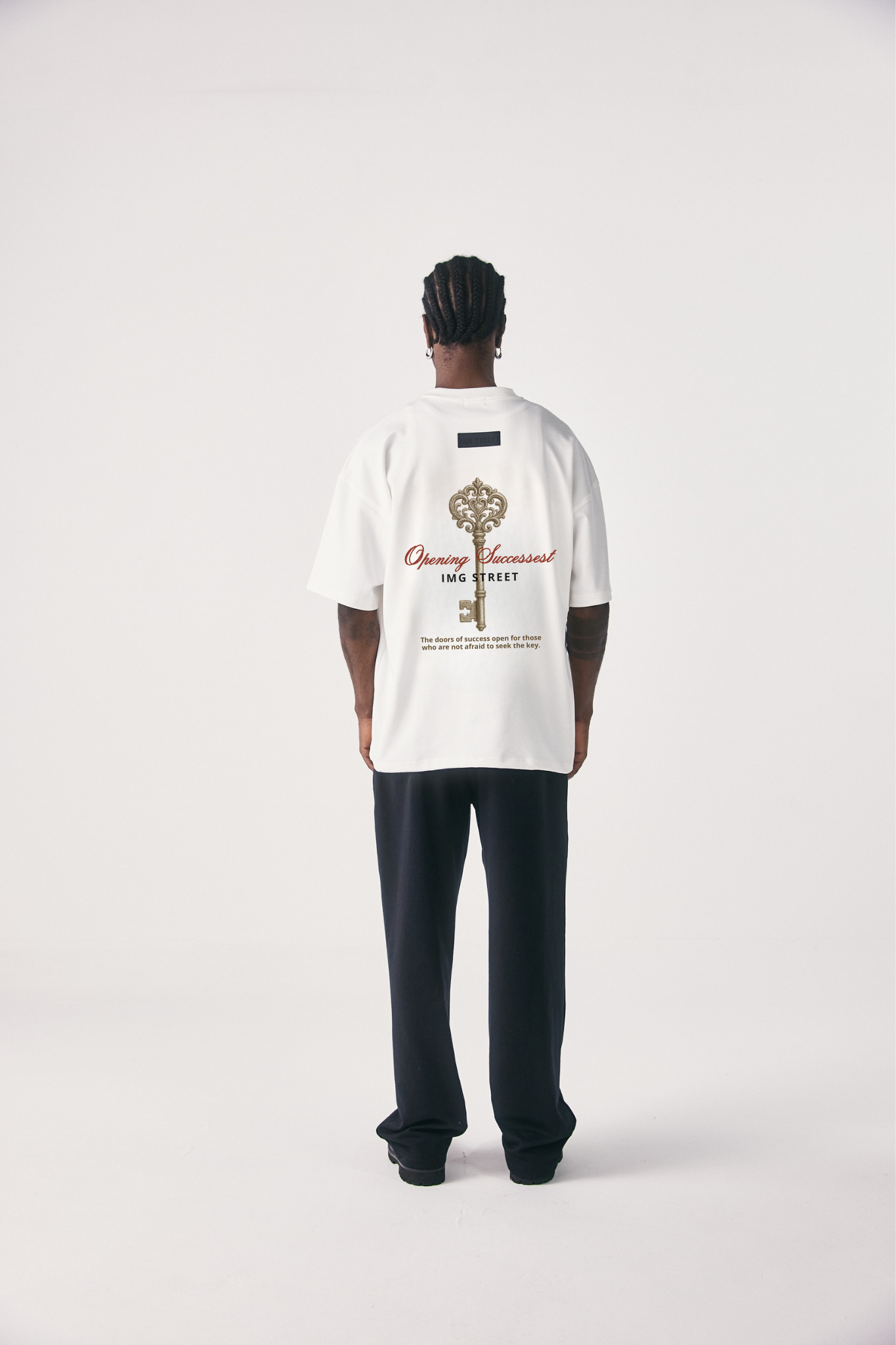 Camiseta oversized en algodón de alto gramaje de 270. Estampado grafico en la parte de atras. El modelo usa talla L – Mide 1.80 m