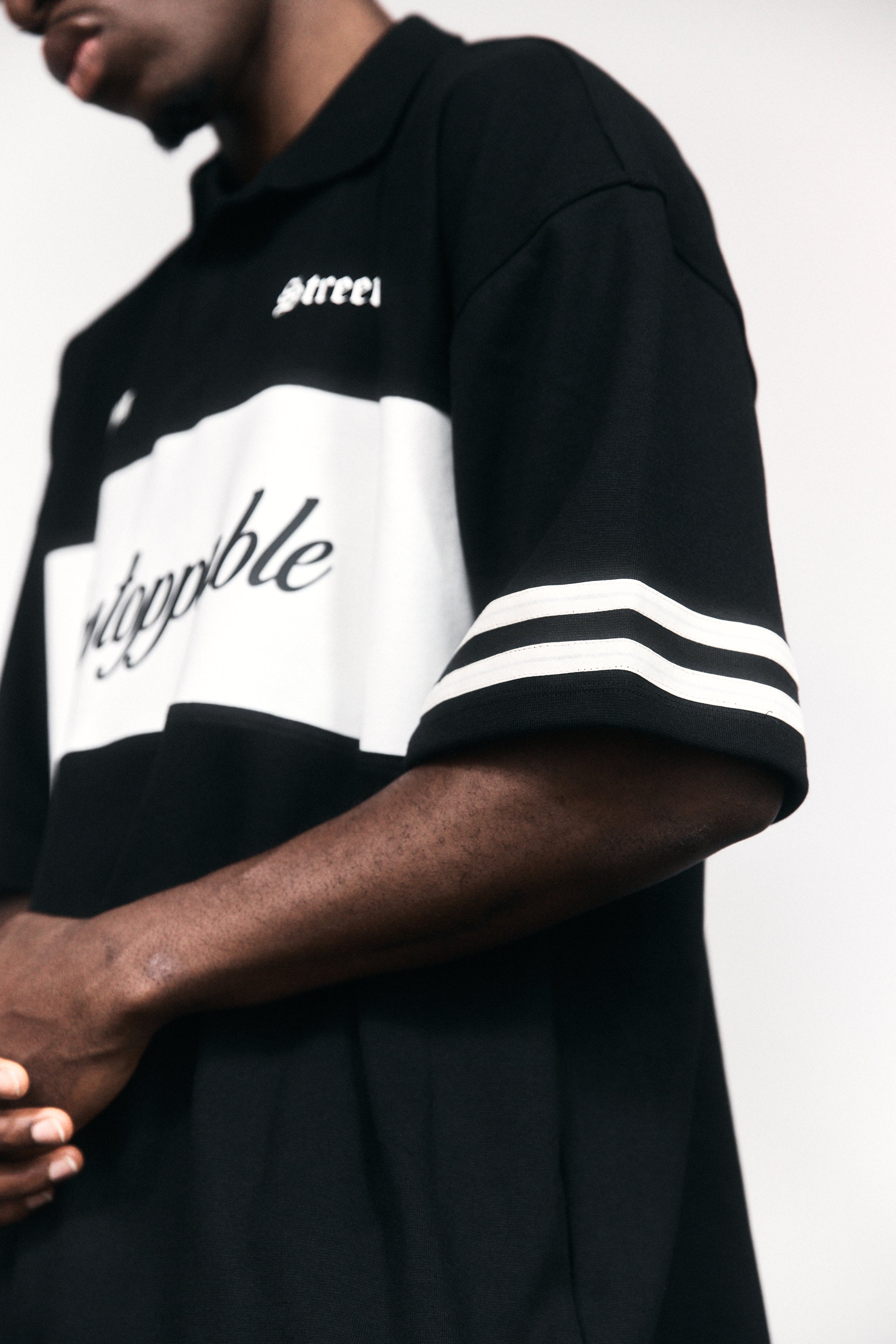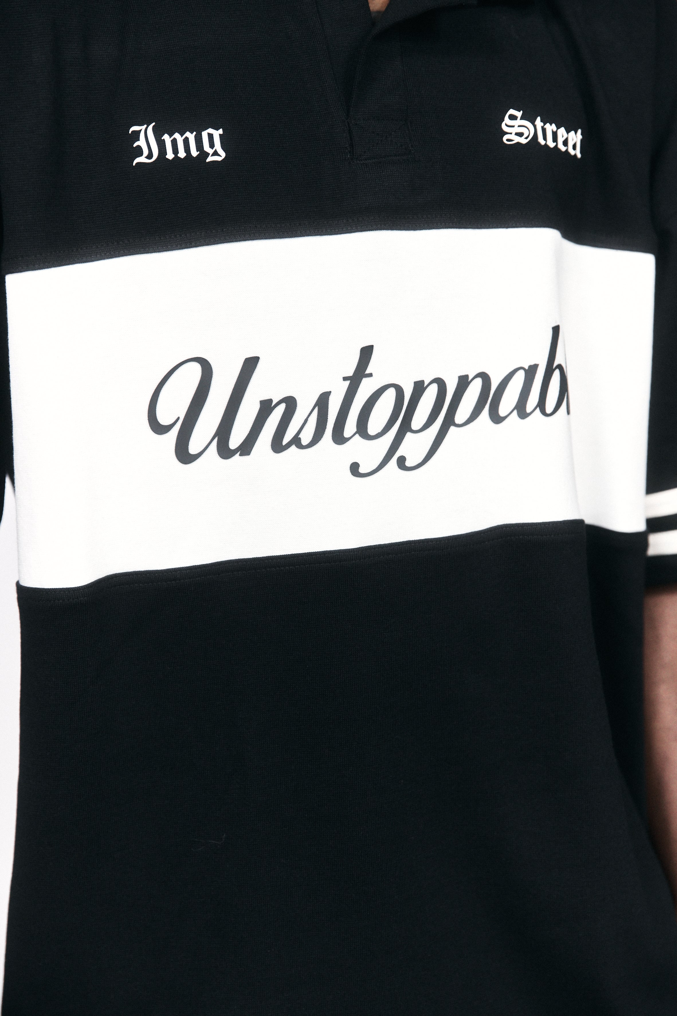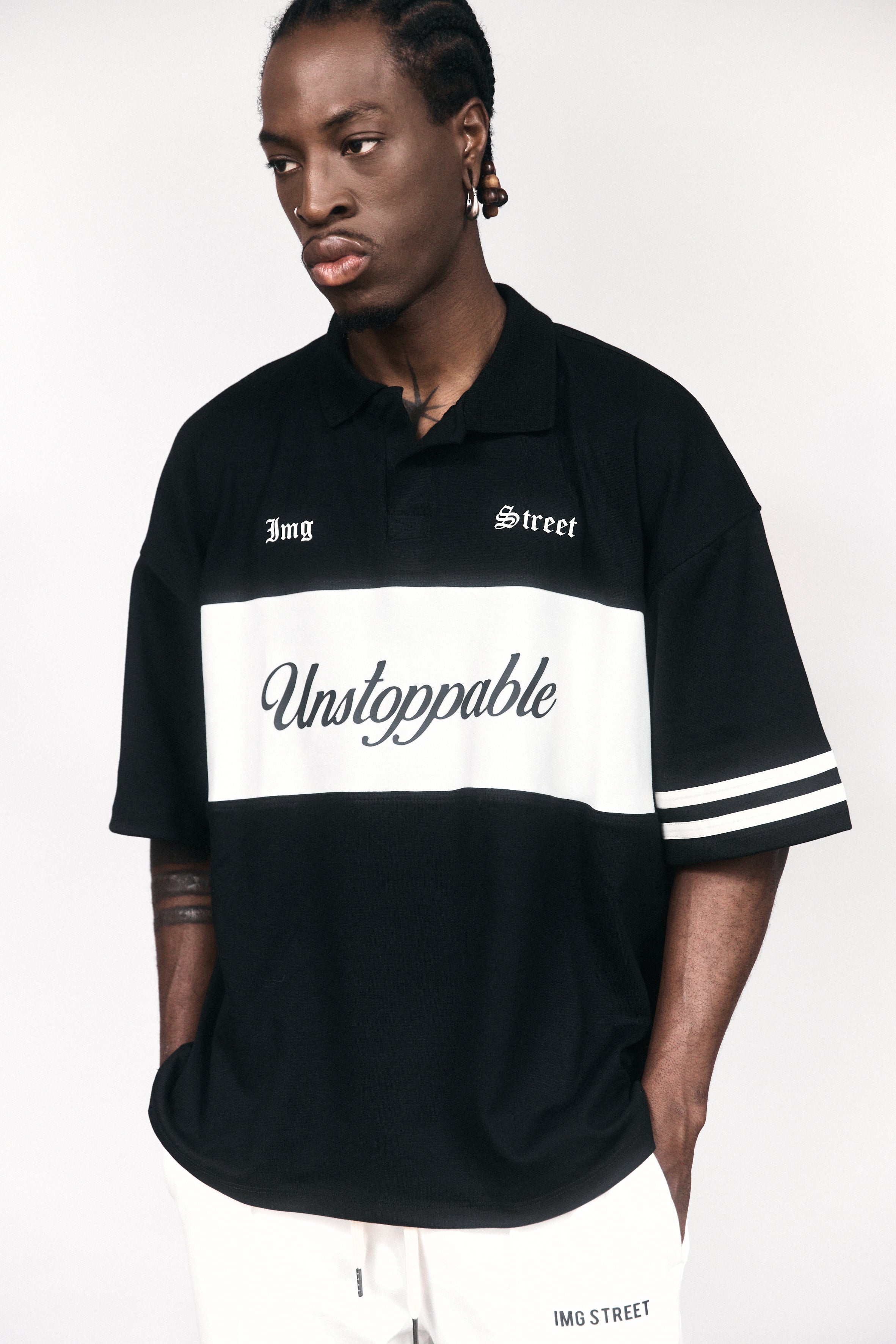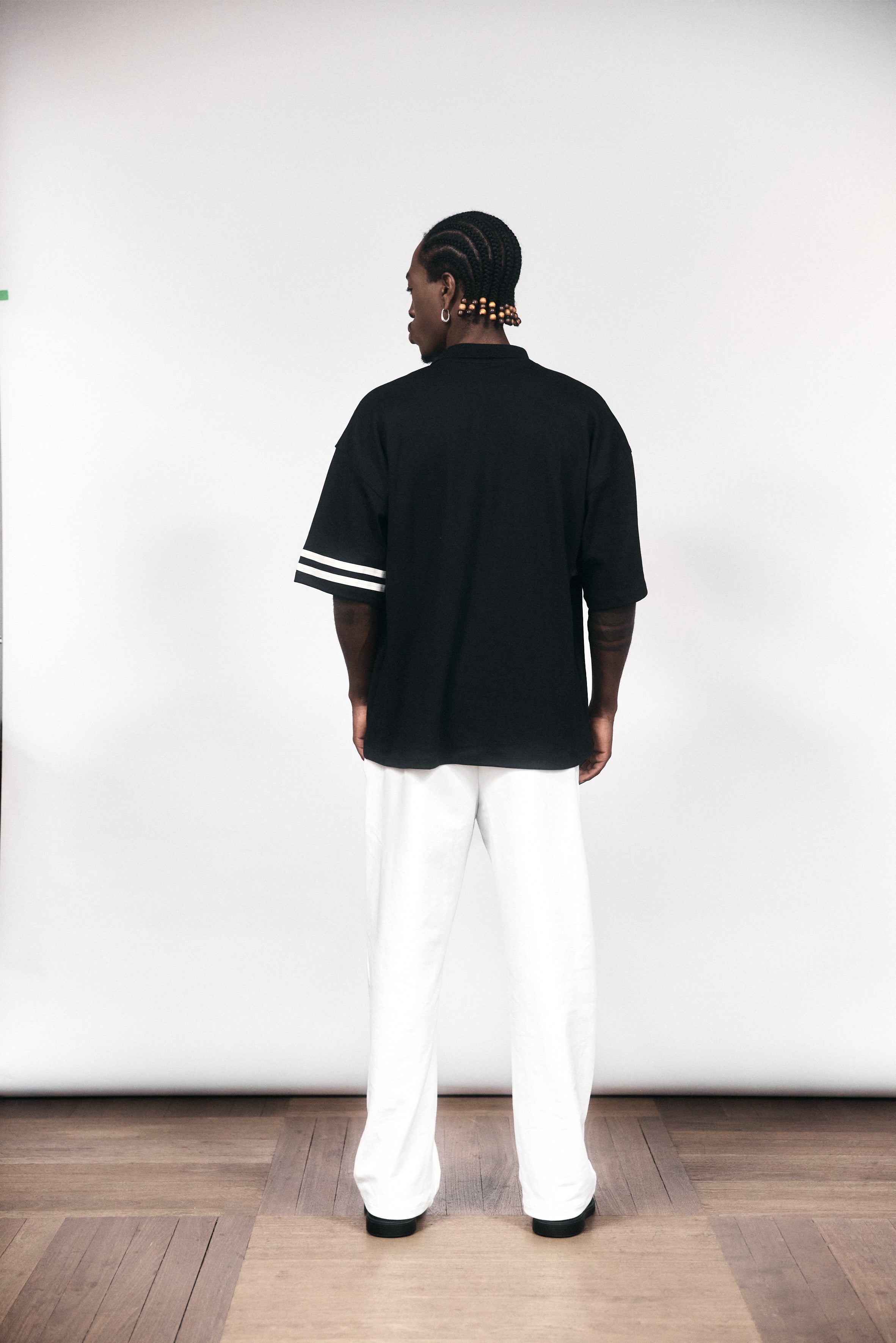 Este polo tipo camiseta en color negro confeccionado en algodón premium de 320g, estampado en alto relieve en el pecho y con cuello en blanco hueso combina la sutileza de los clásicos con una horma moderna de silueta relajada.