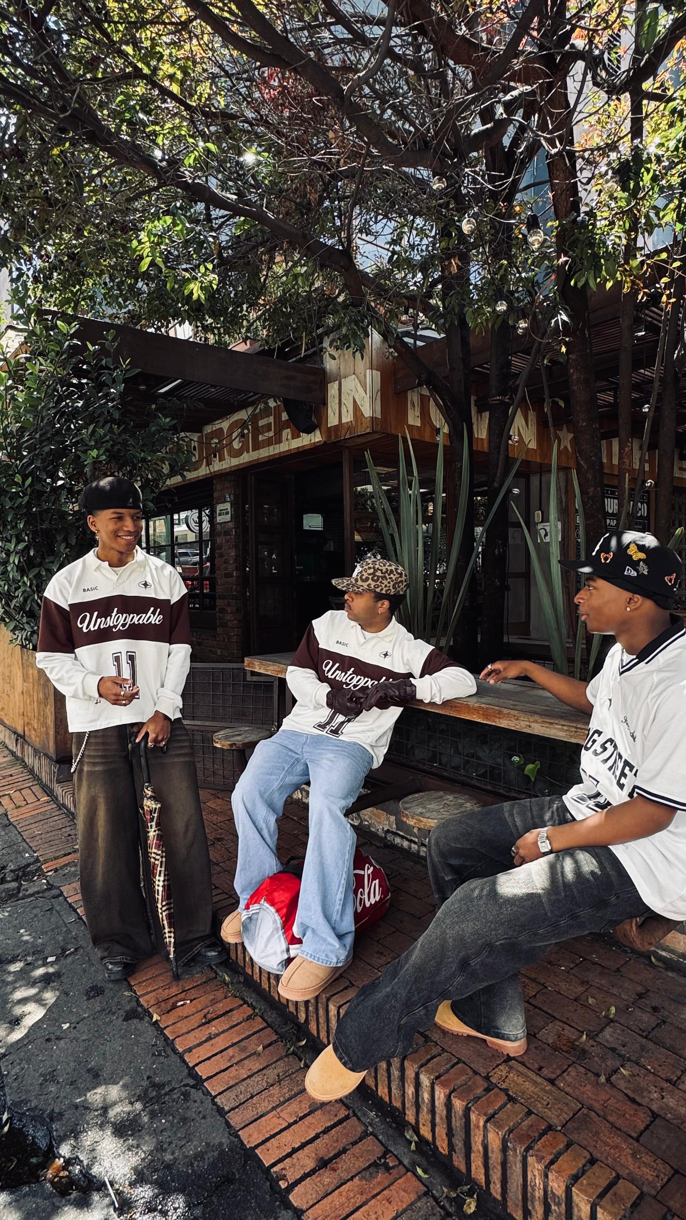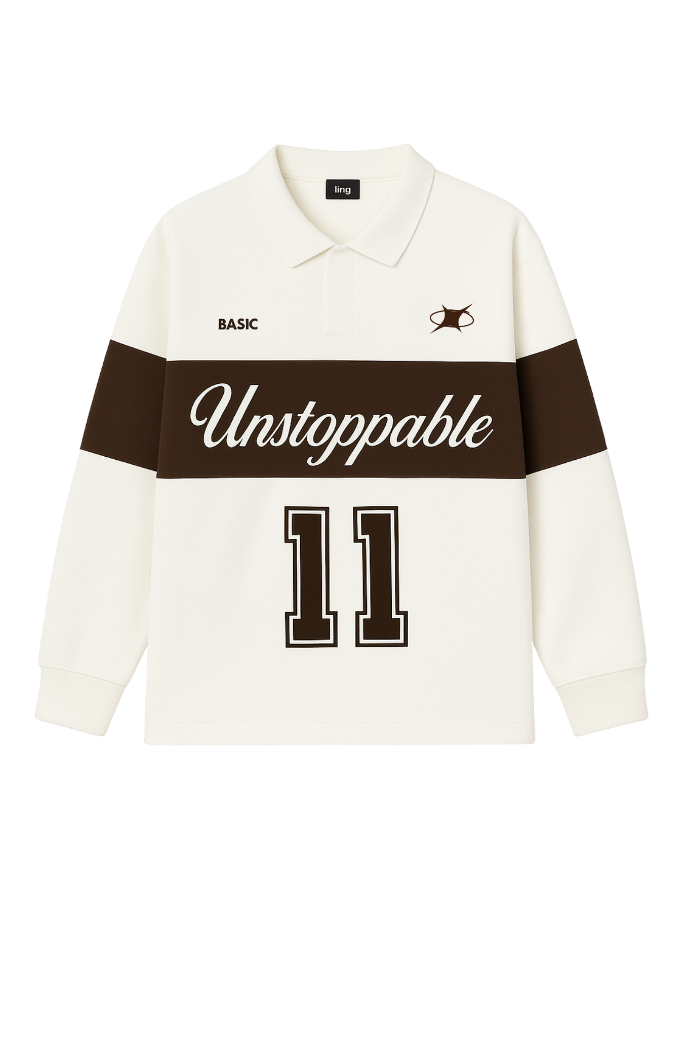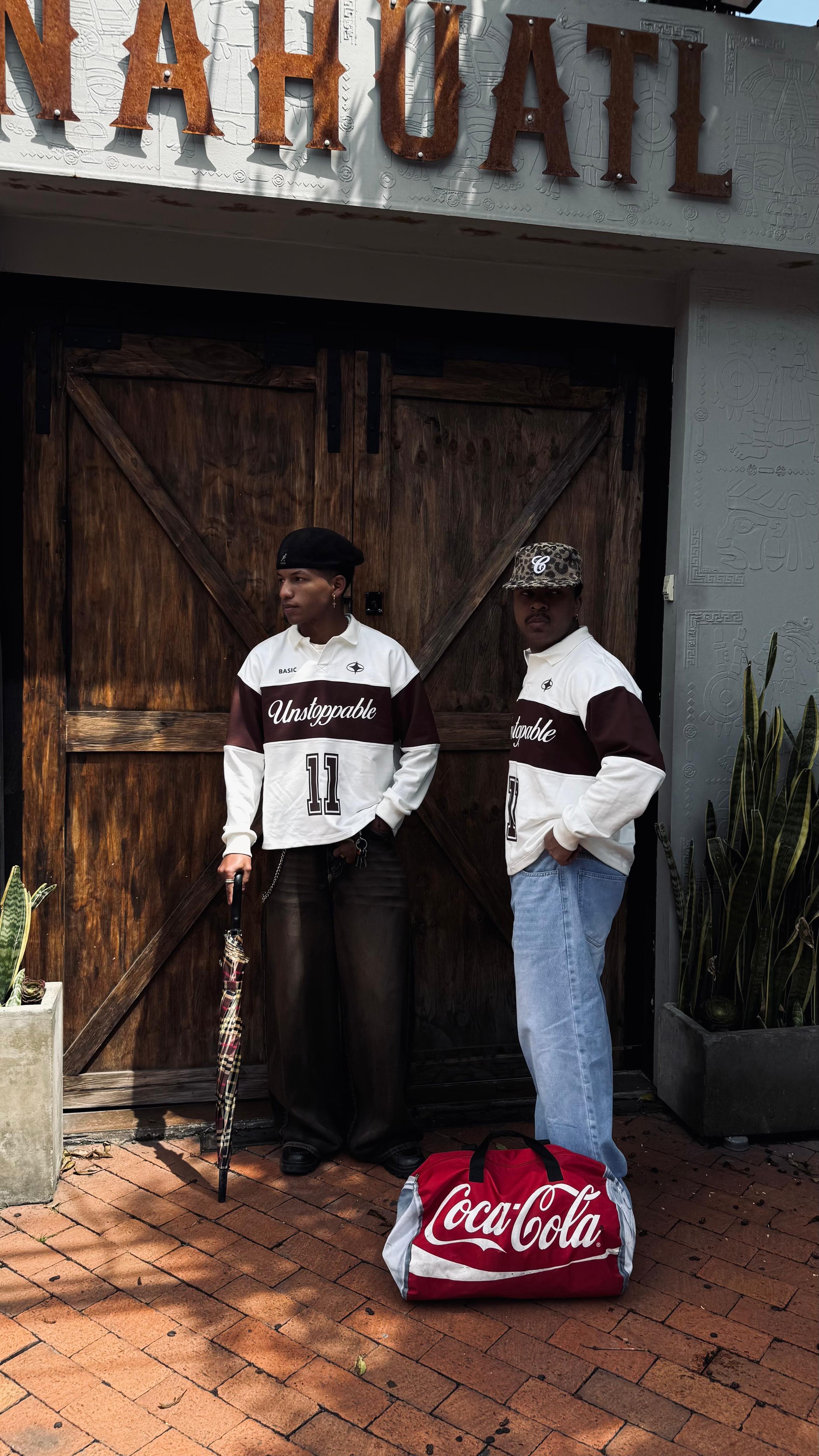 Hoodie oversized color blanco hueso elaborado en burda premium  de 420g, con franja cafe oscuro, cuello tipo polo y estampado en alta densidad.