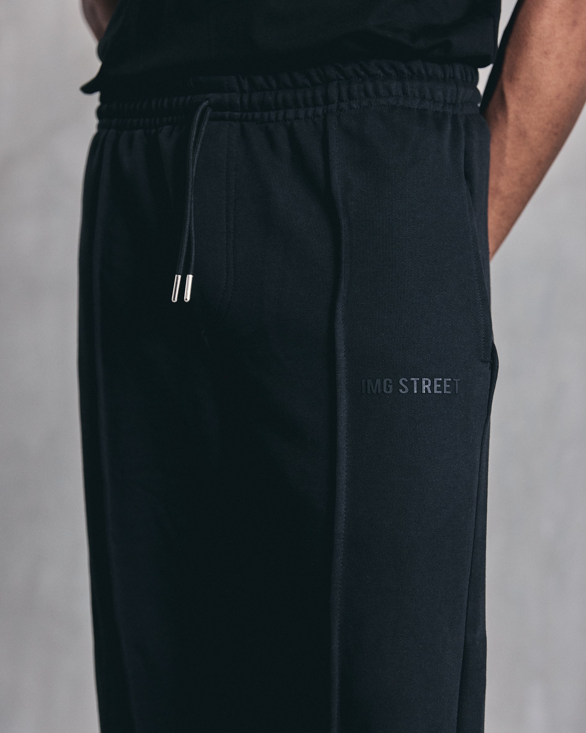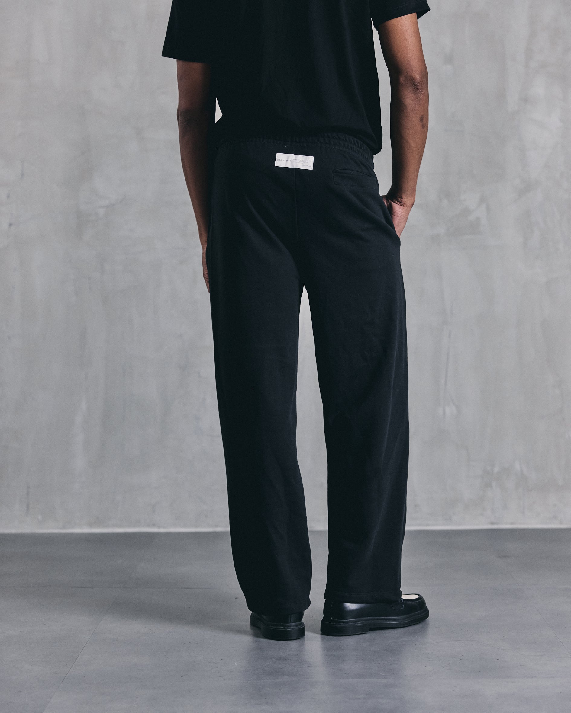 Sudadera negra en burda de 400 g, inspirada en la silueta de un pantalón para vestir. No lleva estampado y tiene detalle de prense para un look más limpio y elevado. Incluye cordón en algodón.